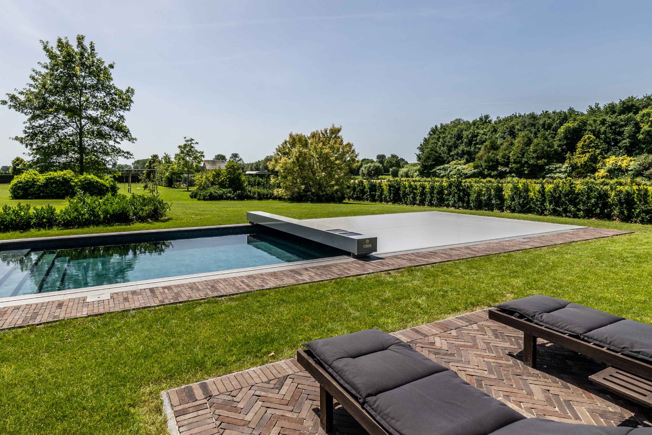 The Coverseal Automatic cover is a product with a modern, elegant and multi-patented design: thanks to its invisible flat structure and maximum projection of 43 x 40 cm, it fits perfectly into the landscape in which the pool is located. What sets it apart is that it is completely green and self-powered, as well as having a patented, ultra-strong, tear-resistant PVC membrane that can be operated by remote control. The membrane protects the pool from weather and dirt (saving on the use of cleaning chemicals) and naturally raises the water temperature. The membrane is also walkable, for greater safety. Among the available options is the possibility to choose a jack and tracks which can be recessed, plus the possibility of customising from various colours for both the sheet and the casing.